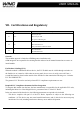 USER MANUAL VII. Certifications and Regulatory Item Feature Description RF: FCC part 15C 6.1 FCC EMI: FCC part 15B FCC grant: TCB Filing fee RF: EN302291 Class B 6.2 CE EMC: EN301489-1/-3 Safety: EN 60950-1:2006/A11:2009 6.3 IC RSS-210 ISSUE 8 RSS-GEN ISSUUE 3 General: This modular approval is limited to OEM/Integrators installation only. OEM integrators are responsible for ensuring that the end-user has no manual instructions to remove or install module.