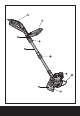 Tonte Tenez le bas de la tête de coupe approximativement 8 cm au-dessus du sol et à angle. Permettez seulement à la pointe du cordon de coupe de faire contact. Ne forcez pas le cordon de coupe dans l’aire de travail. Tonte de bordure (Voir H) Dévissez le bouton supérieur d’ajustement (3), tournez la poignée principale et auxiliaire de 90 degrés, et resserrez le bouton. Ajustez l’angle de la tête de coupe de façon à ce qu’elle soit directement en ligne avec le manche (horizontale).
