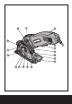 1. Blødt gummi greb 2. Motor Hus 3. Start-stop-kontakt 4. Skala Til Savedybde 5. Håndtag til frigørelse af afskærmning 6. Fingerløftsbøjle 7. Støvslange (Se Fig. Q) 8. Nederste Afskærmning 9. Afskærmning af øvre blad 10. Indikator til måling af udskæring 11. Pakning til bladspænder 12. Spindelskrue 13. Monteringsindstik til parallelt styr 14. Håndtag Til Dybdeindstilling 15. Laserstyr og LED arbejdslys 16. Knap til indstilling af håndtag 17. Kontakt til at tænde/slukke laser og LED 18.