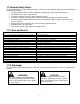 3 Specifications Engine • • See your engine owner’s manual RPM: Full speed 3600 +/- 50 RPM (no load) / Idle: 1550 RPM Electrical System • • • • Charging System: Internal stator coil Battery Type: Maintenance free Battery Voltage: 12 Volts Fuses: Two, 20 amp blade type Fuel System • • • • Capacity: 5.6 Gal. (L) Type of Fuel: Unleaded regular gasoline, minimum 85 octane. Do not use gasoline containing more than 10% ethanol. Do not mix oil with gasoline.