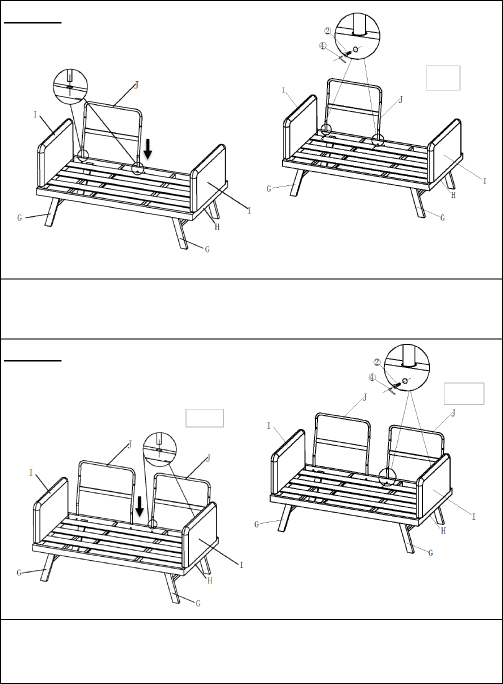 6.2 Attach another Backrest(J) to Seat(H) using Bolts(②)with Allen Key(④) as shown above.