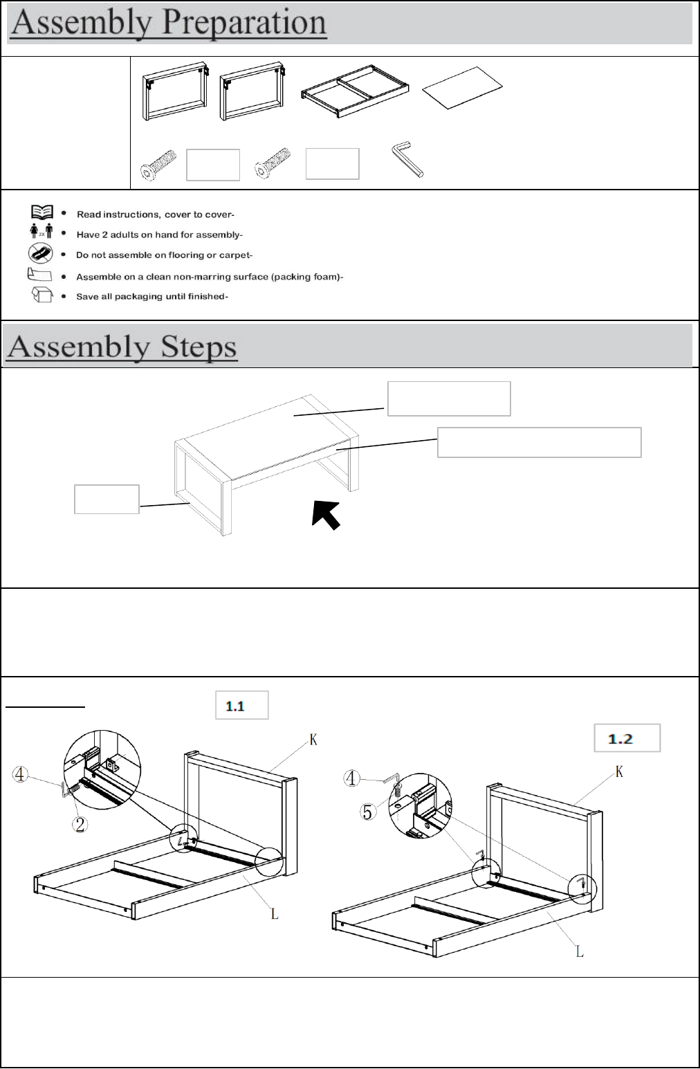 1.1Attach Leg(K) to Table Top Frame(L) using Bolts(②) with Allen Key(④) as shown above.