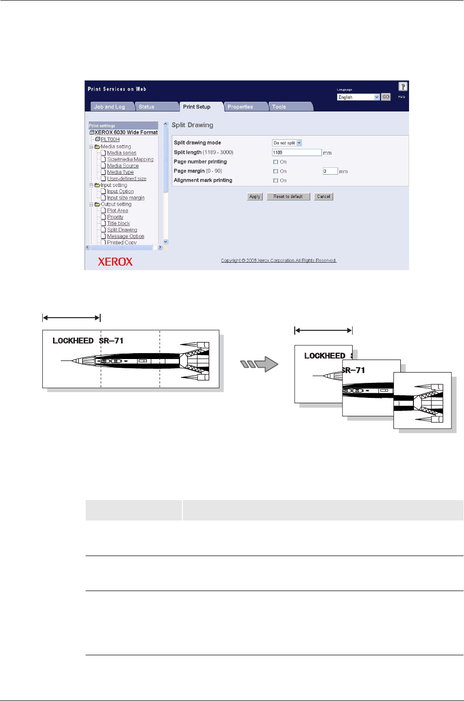 Split length Sets the print length within a range of 1,189 to 3,000 mm.