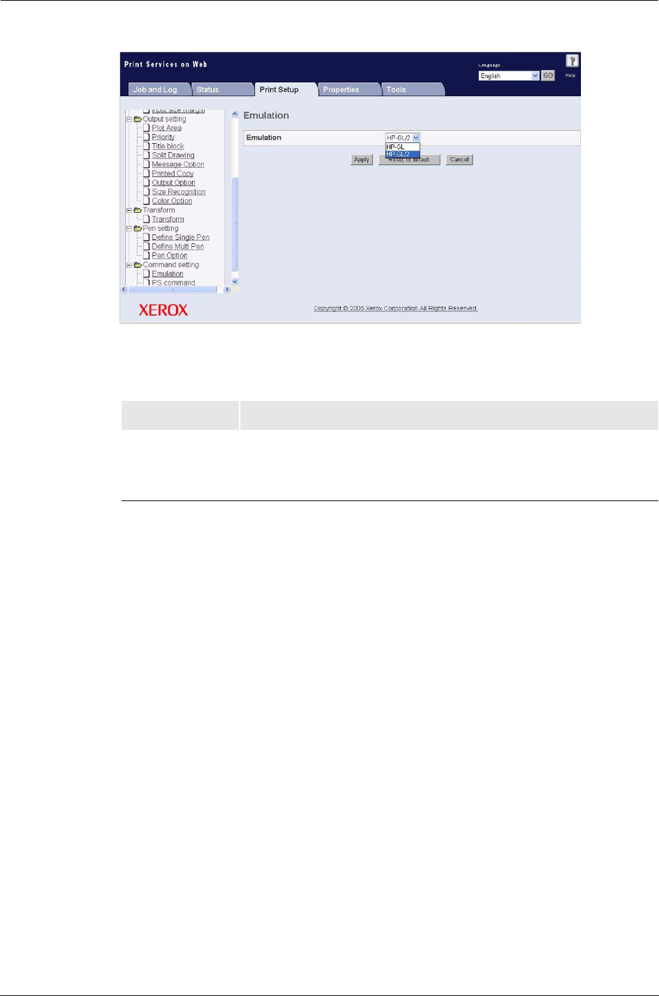 Emulation Sets the processing language at either [HP-GL] or [HP-GL/