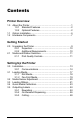 Contents Printer Overview 1.0 1.1 1.2 About the Printer ....................................................................... 1 1.0.1 Standard Features .................................................... 2 1.0.2 Optional Features ..................................................... 2 Option Installation..................................................................... 6 Hardware Components............................................................. 7 Getting Started 2.0 2.