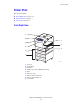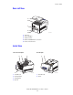 Printer Parts Printer Parts This section includes: ■ ■ ■ Front-Right View on page 1-2 Rear-Left View on page 1-3 Inside View on page 1-3 Front-Right View 1 2 7 3 8 4 9 5 6 6300-099 1. Top cover 2. Control panel 3. Front Door 4. Handle to open Tray 1 (Multi-Purpose Tray) 5. Tray 2 6. Trays 3, 4, and 5 7. Button to open Front Door B 8. Latch to open Front Door A 9.