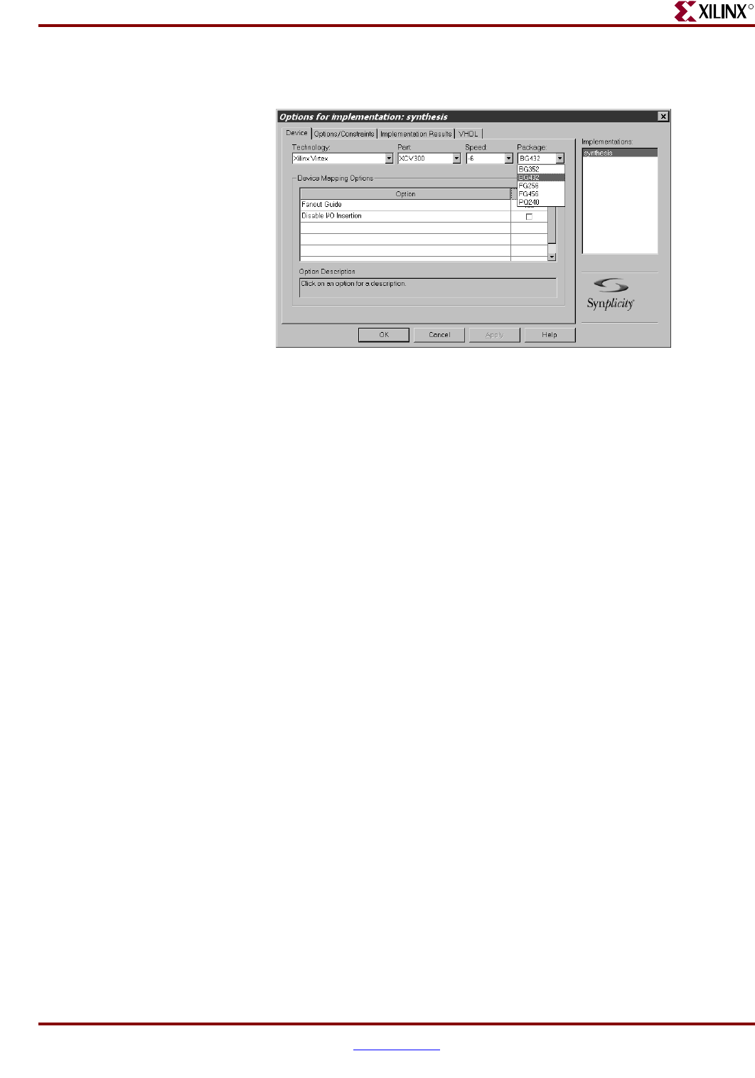 targeted device (a V300BG432-6 in this example). Be sure that Disable I/O Insertion is