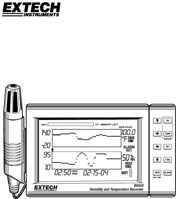 Introduction Congratulations on your purchase of the Extech RH520 Temperature + Humidity Chart Recorder. The RH520 measures and displays Temperature, Humidity, and Dew Point. The remote (detachable) probe senses the ambient conditions while the LCD display graphs and provides numerical representation of the readings. Programmable audiovisual alarms alert the user when ambient conditions reach alarm presets. The optional alarm module permits automatic relay switching when alarm presets are reached.
