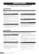• Before moving the instrument, remove all connected adaptor and other cables. • Use only the stand specified for the instrument. When attaching the stand or rack, use the provided screws only. Failure to do so could cause damage to the internal components or result in the instrument falling over. Connections • Before connecting the instrument to other electronic components, turn off the power for all components.