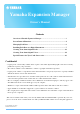 Yamaha Expansion Manager Owner’s Manual Contents Overview of Yamaha Expansion Manager ........................................................... 2 Screen Items & Functions ..................................................................................... 4 Managing Pack Data ............................................................................................. 6 Installing Pack Data on a Digital Instrument ..................................................... 7 Creating Your Own Original Packs..