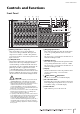 Controls and Functions Controls and Functions Front Panel 1 2 3 45 6 7 89 0 A B 3 1 [INPUT] Connectors 1–32 {1–16} These are the XLR-3-31 type analog balanced connectors for the input channels. The input level range is from –62 dBu to +10 dBu. +48V phantom power can be supplied to devices that require it via the input connectors. 2 [+48V] Indicators These indicators light when +48V phantom power is turned ON for the corresponding input channels.