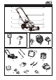 DESCRIPTION OF PRODUCT PARTS TECHNICAL SPECIFICATIONS Parts list (See Fig. 1, Fig. 2 & Fig. 3) 1. Self-propelled switch lever 2. Safety lock button 3. Grass bag 4. Height adjustment knob 5. Side discharge guard 6. Front bumper handle 7. Power head 8. Cable clip 9. Handle quick-release knob 10. Operator presence control bar 11. Mulching plug 12. Side discharge deflector 13. Safety key 14. Battery pack 15. Battery charger Item No.