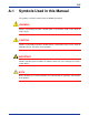 A-2 A-1 Symbols Used in this Manual The symbols used in this manual have the following meanings. WARNING Indicates a potentially hazardous situation which, if not avoided, could result in death or serious injury. CAUTION Indicates a potentially hazardous situation which, if not avoided, may result in minor or moderate injury. It also alerts unsafe practices. IMPORTANT Indicates handling of the hardware or software which may cause damage or lead to a system failure.