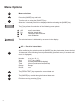 Menu Options Menu selections Mode On Press the [MODE] key and hold. Off Turn the unit on using the [ON/OFF] key. Allow the 3 decimal points to be displayed before releasing the [MODE] key. ! Store Date 1 3 2 4 Time Cal The [!] key allows for selection of the following menu points: 1 diS Prt 3 1 2 4 Store 1 Date diS Time recall stored data printing stored data setting the date and time user calibration The selected menu is indicated by an arrow in the display.
