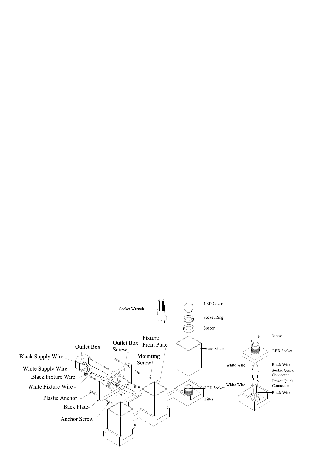 8. Place Glass Shade, onto Fitter, slide Spacer and Socket Ring onto LED Socket, use Socket Wrench to