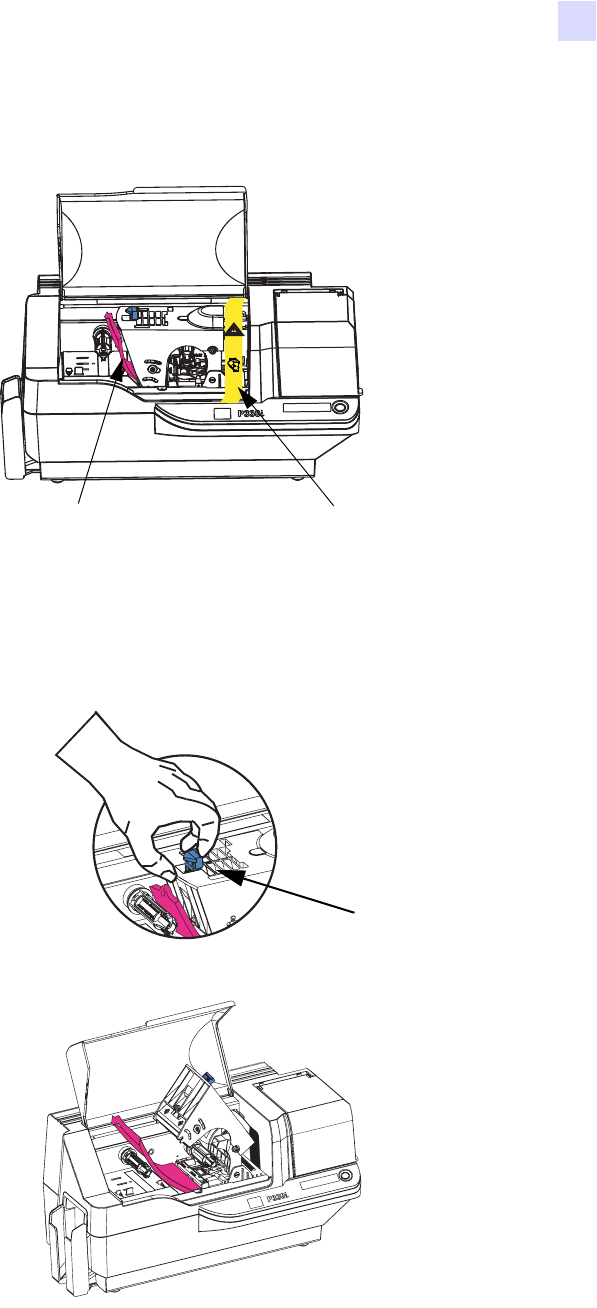 Installation and Setup Loading a Ribbon • • From the main menu of your documentation CD, select your desired language and then select “DRIVERS” from the subsequent menu. The Install Wizard will walk you through the appropriate steps. Delete previous versions of the driver and clean up any necessary Registry entries. You must select “Remove” from the install options to remove any previous driver versions. Loading a Ribbon i Series Printers require the use of i Series ribbons for full color printing.