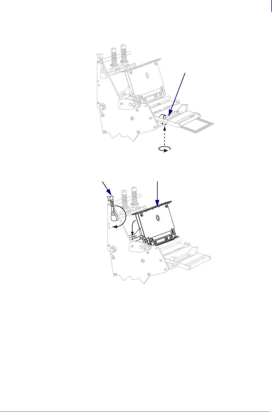 10. Push down the printhead assembly (1), and then rotate the printhead-open lever (2)