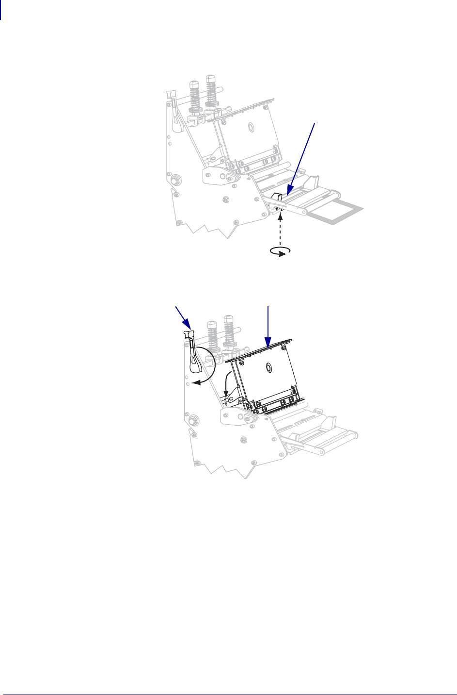 15. Push down the printhead assembly (1), and then rotate the printhead-open lever (2)
