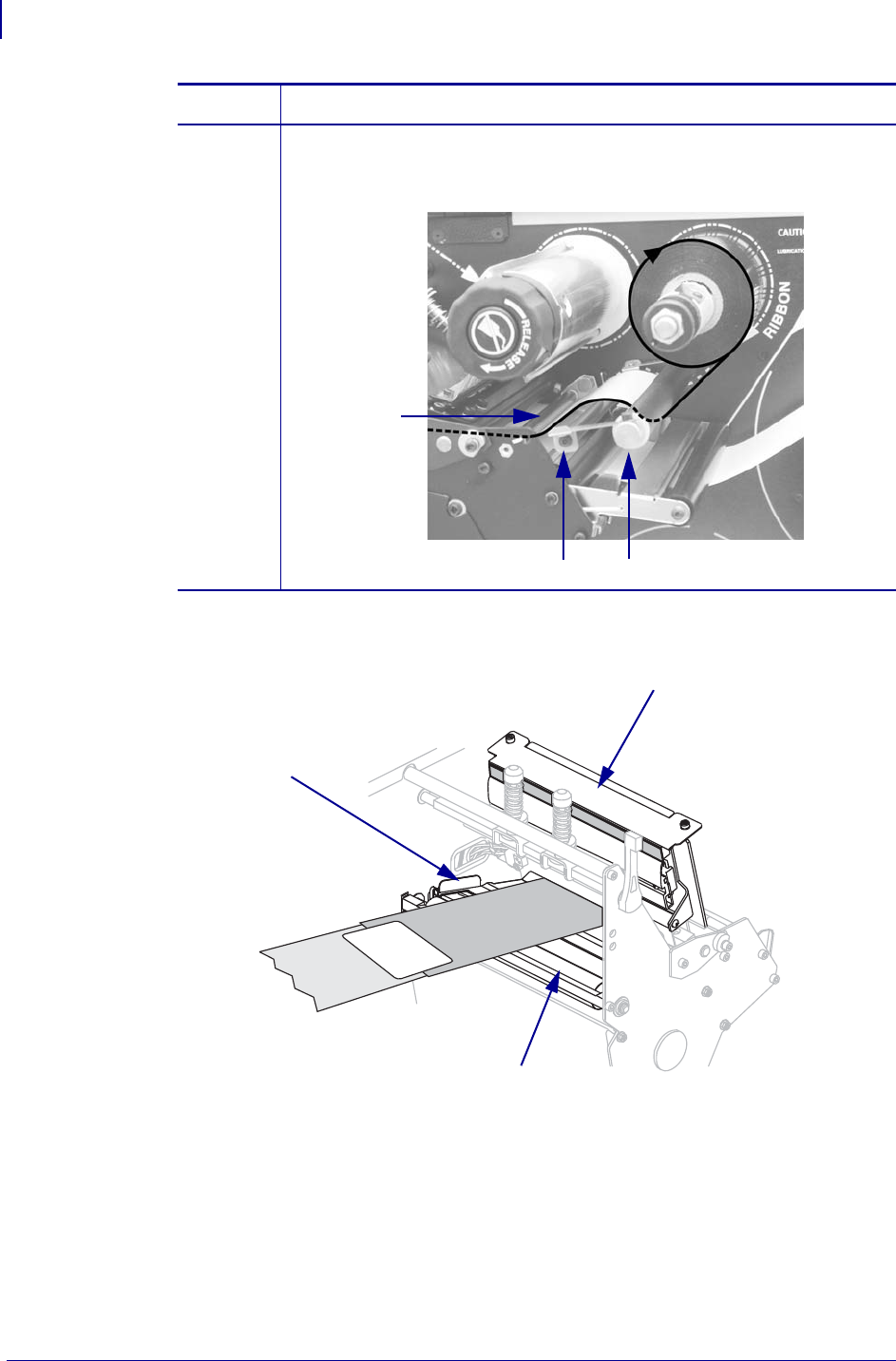 8. Push the ribbon leader forward until it passes under the printhead assembly (1), over the