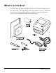 What’s in the Box? Save the carton and all packing materials in case you need to ship or store the printer later. After unpacking, make sure you have all parts. Follow the procedures for inspecting the printer to familiarize yourself with printer parts so you can follow the instructions in this book. 2 980441-001 Rev.
