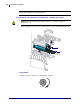 Load Ribbon and Media Caution • When you are loading media or ribbon, remove all jewelry that could come into contact with the printhead or other printer parts. To load ribbon and roll media in Tear-Off mode, complete these steps: 1. Caution • The printhead may be hot and could cause severe burns. Allow the printhead to cool. Rotate the printhead-open lever (1) counterclockwise to release the print mechanism (2). 1 2 Loading Ribbon 2. Position the ribbon with the loose end unrolling clockwise.