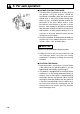 7. Operation WARNING • Weather conditions and altitude may effect carburation. • Do not allow anyone to stay close to the hedge-trimmer while working or while adjusting the carburetor. ■ HOW TO USE HANDLE (CHT2301 only) To reduce fatigue when trimming hedges, the handle can be swivelled through 90° to the left or right. (OP6, OP7). Do not press the throttle during this operation! OP6 (2) 90° (1) 90° OP7 Proceed as follows: 1. Free the handle by pressing the locking lever; (OP6) 2.