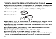 STARTING THE ENGINE ● Close the choke lever and open the throttle valve 10% to 15%. ● Pressing the tip of the starter to the engine’s spinner, press the start switch for 1-2 sec and let the engine rotate. ● If the engine has made an explosive sound, suspend the starting operation and start by opening the choke lever and rotating the engine using the starter. (Opening or closing the choke lever during engine operation is prohibited.