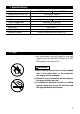 5. Maintenance 5) IGNITION SYSTEM Items Standard Limit Measuring Device Spark Plug Air Gap (mm) 0.6~0.7 0.7 Thickness Gauge Ignition Coil/Flywheel Air Gap (mm) 0.3 0.4 Thickness Gauge Primary 0.7 — Volt Meter Reading between primary terminal and iron core. Secondary 6100 — Volt Meter Reading between sparking cord end and iron core. Coil Resistance (Ω) Remarks 6) TIGHTENING TORQUE Items Screw Size Standard (kg·cm) Limit (kg·cm) Carburetor M5 (P=0.