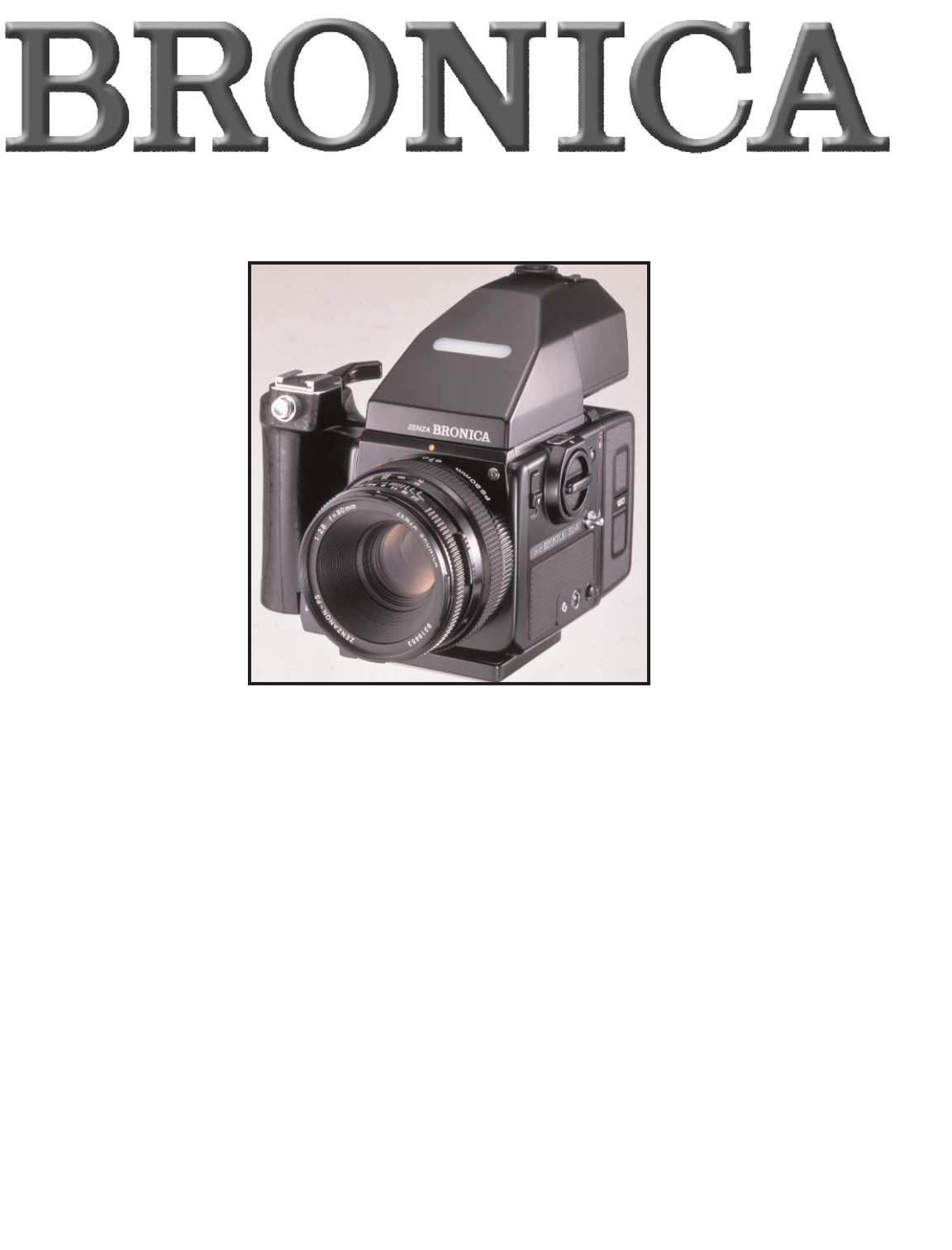 Specifications of the ZENZA BRONICA SQ-Ai Type 6 x 6 cm format lens shutter single lens reflex camera, with interchangeable lens, film back, finder and focusing screen systems. Frame Size Film 55.6mm x 55.6mm 120/220/135 roll film and Polaroid Land pack film, with exclusive film backs. Lens Interchangeable type. Standard lens Zenzanon-PS 80mm F2.8; 6 elements in 5 groups; multi-layer anti-reflection coated; 50.
