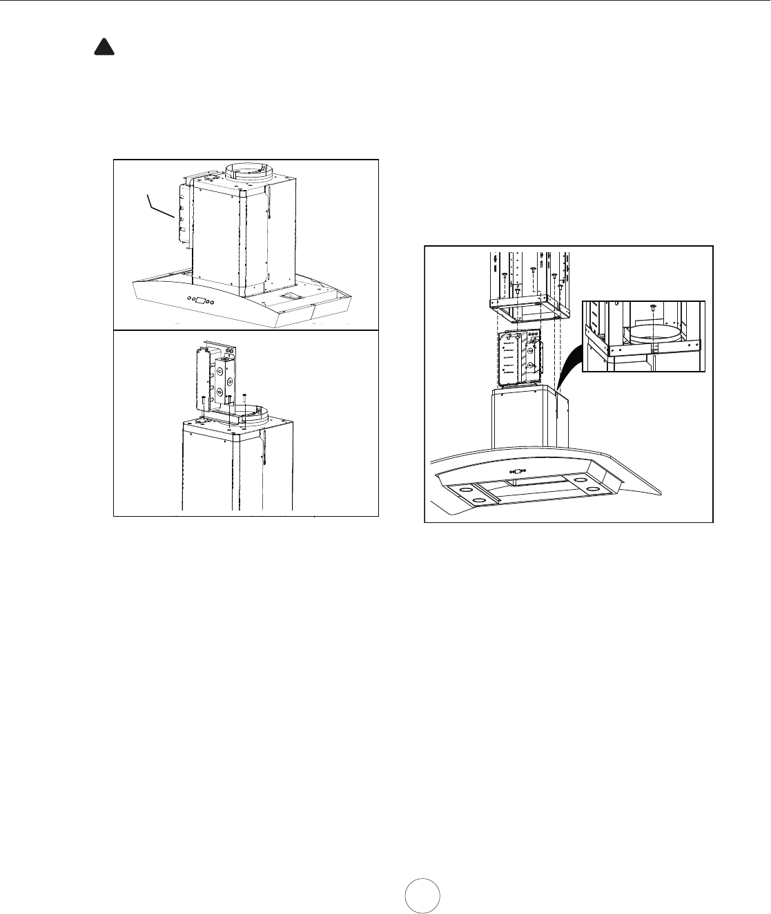 8. Soulevez le boîtier de la hotte et alignez les quatre vis de montage préinstallées sur le dessus du boîtier du
