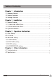 Table of Contents Chapter 1 Introduction 1.1 Important Notices............................................................................................... 2 1.2 Product Functions.............................................................................................. 2 1.3 Package Contents.............................................................................................. 3 Chapter 2 Installation 2.1 Product Outward..........................................................................