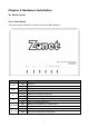2.1.2 Rear Panel The rear panel contains the following features. (Viewed from left to right) Name Power Connector RJ-45 Connector Reset Button Antenna Connector Description Power Jack only use the power adapter applied with ZEW3003 to prevent damage One LAN 10/100Mbps RJ45 port for connecting to the router/modem, local PC or switch/hub. Factory Default Reset button One external dipole antenna There is a way to reset the ZEW3003’s factory defaults by using the Factory Default Reset button: 1.