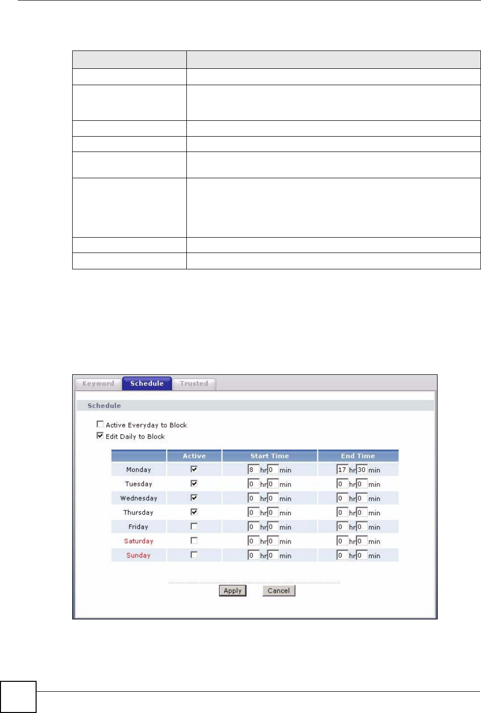 To set the days and times for the P-660HWP-Dx to perform content filtering, click Security >