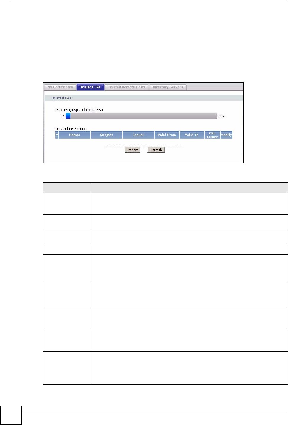 Click Security > Certificates > Trusted CAs to open the Trusted CAs screen. This screen