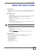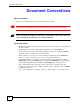 Document Conventions Document Conventions Warnings and Notes These are how warnings and notes are shown in this User’s Guide. 1 " Warnings tell you about things that could harm you or your IES-612-51A. Notes tell you other important information (for example, other things you may need to configure or helpful tips) or recommendations. Syntax Conventions • The IES-612-51A may be also referred to as the “device”, the “system” or the “product” in this User’s Guide.