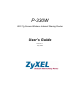 ZyXEL P-330W User’s Guide Preface Congratulations on your purchase of the P-330W, 802.11g Secure Wireless Internet Sharing Router. This manual is designed to guide you through the configuration of your P-330W for its various applications. This manual may refer to the P-330W or 802.11g Secure Wireless Internet Sharing Router as the router. Note: Register your product online to receive e-mail notices of firmware upgrades and information at www.us.zyxel.com.