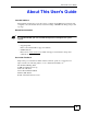 About This User's Guide About This User's Guide Intended Audience This manual is intended for people who want to configure the ZyXEL Device using the web configurator. You should have at least a basic knowledge of TCP/IP networking concepts and topology. Related Documentation " It is recommended you use the web configurator to configure the ZyXEL Device. • Supporting Disk Refer to the included CD for support documents. • ZyXEL Web Site Please refer to www.zyxel.