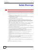Safety Warnings Safety Warnings 1 For your safety, be sure to read and follow all warning notices and instructions. • Do NOT use this product near water, for example, in a wet basement or near a swimming pool. • Do NOT expose your device to dampness, dust or corrosive liquids. • Do NOT store things on the device. • Do NOT install, use, or service this device during a thunderstorm. There is a remote risk of electric shock from lightning. • Connect ONLY suitable accessories to the device.