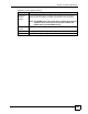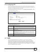 Chapter 15 Remote Management Configuration The following table describes the labels in this screen. Table 86 Remote Management: SNMP LABEL DESCRIPTION SNMP Port You may change the server port number for a service if needed, however you must use the same port number in order to use that service for remote management. Access Status Select the interface(s) through which a computer may access the ZyXEL Device using this service.