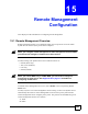 Chapter 15 Remote Management Configuration 15.1.1 Remote Management Limitations Remote management over LAN or WAN will not work when: • You have disabled that service in one of the remote management screens. • The IP address in the Secured Client IP field does not match the client IP address. If it does not match, the ZyXEL Device will disconnect the session immediately. • There is already another remote management session with an equal or higher priority running.