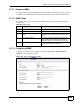 Chapter 15 Remote Management Configuration 15.7.1 Supported MIBs The ZyXEL Device supports MIB II that is defined in RFC-1213 and RFC-1215. The focus of the MIBs is to let administrators collect statistical data and monitor status and performance. 15.7.2 SNMP Traps The ZyXEL Device will send traps to the SNMP manager when any one of the following events occurs: Table 85 SNMP Traps TRAP # TRAP NAME DESCRIPTION 0 coldStart (defined in RFC-1215) A trap is sent after booting (power on).