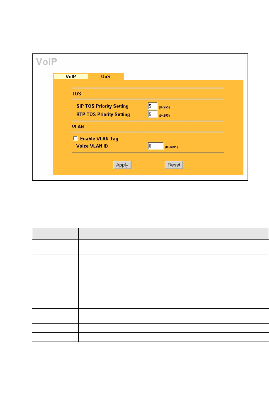 Click VoI P in the navigation panel and then QoS to display the following screen.