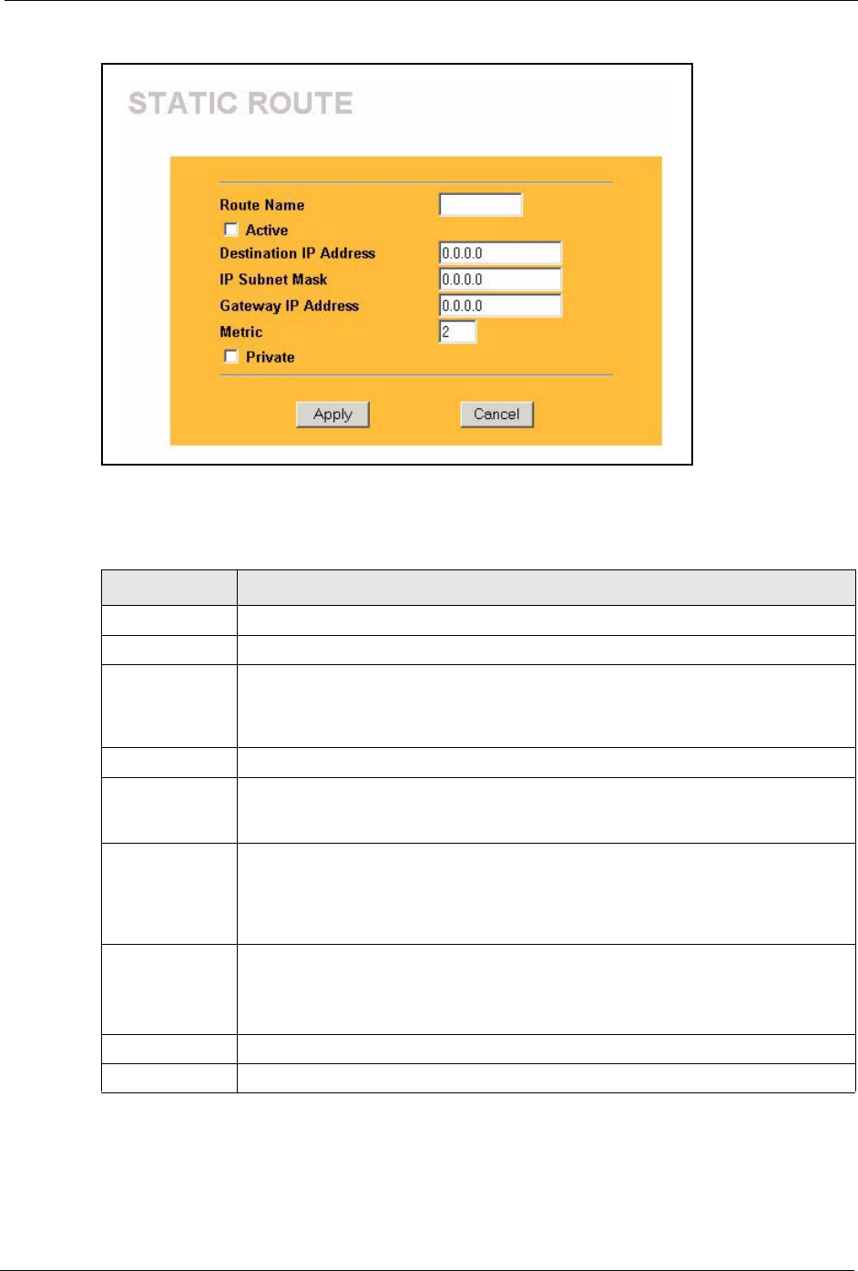 Route Name Enter the name of the IP static route. Leave this field blank to delete this static route.