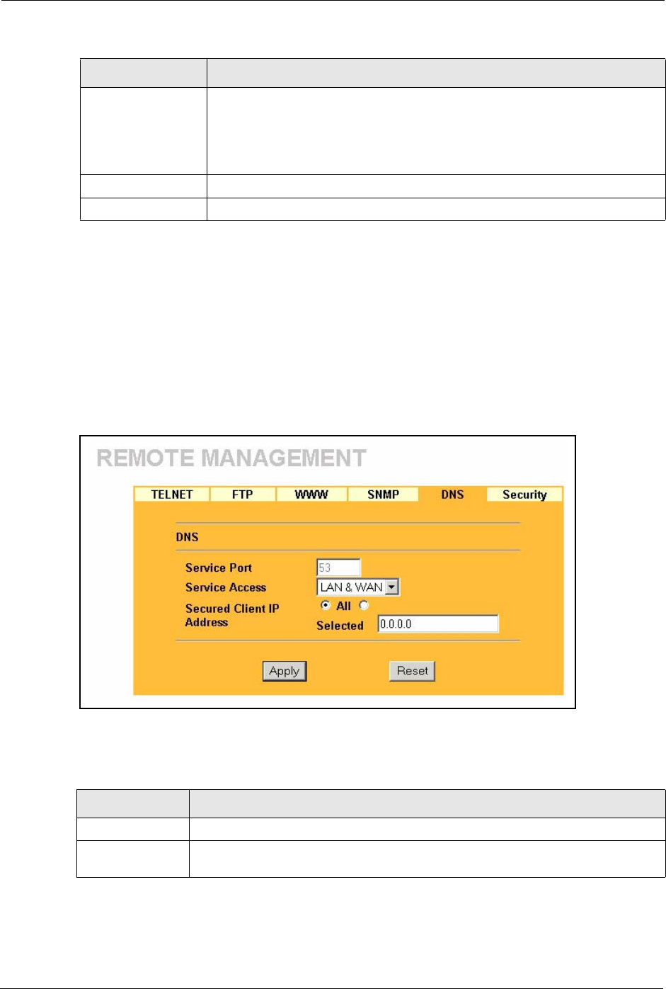 To change your Prestige’s DNS settings, click REMOTE MGMT, then the DNS tab. The