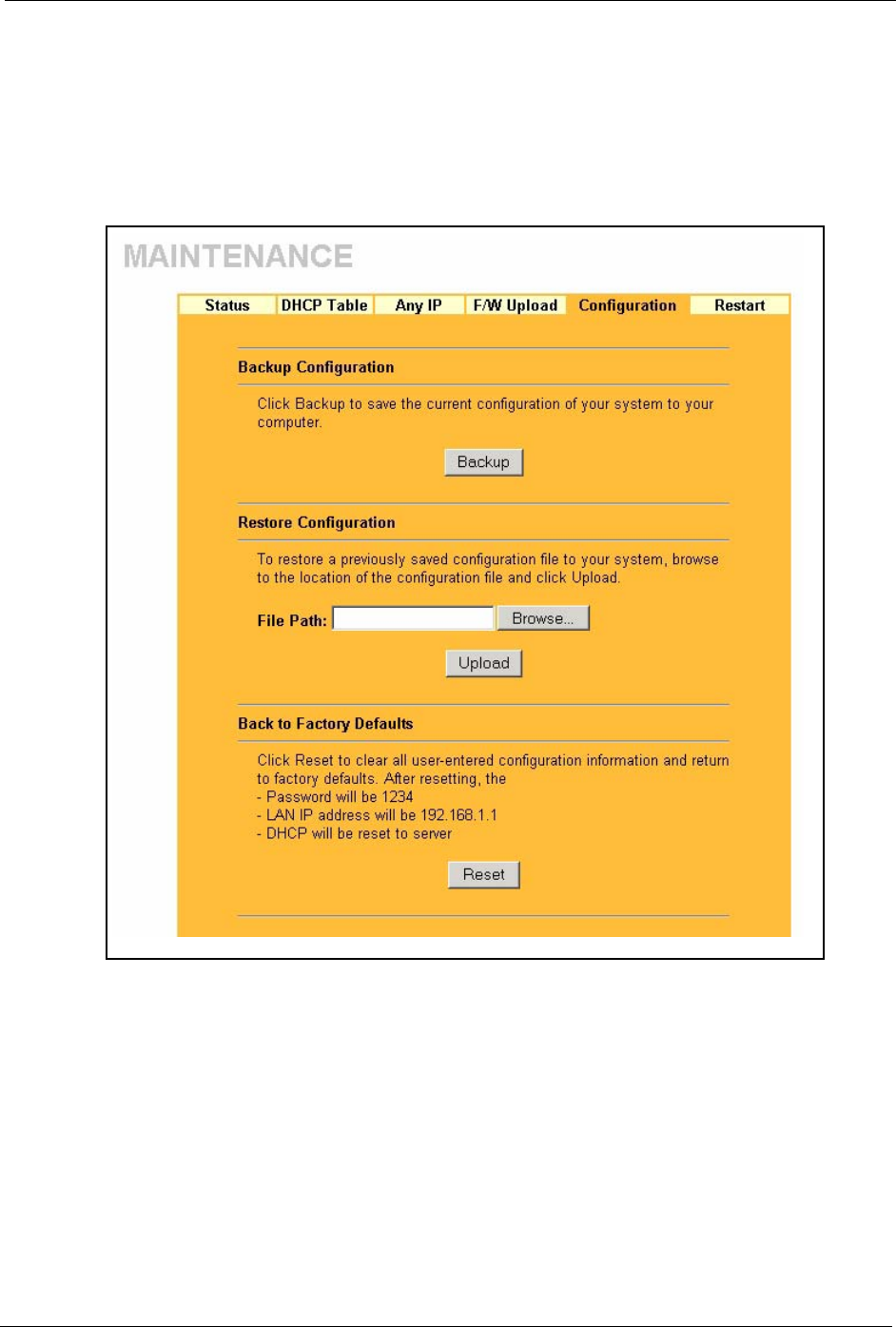 related to factory defaults, backup configuration, and restoring configuration appears as shown