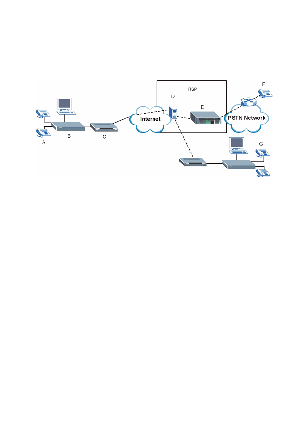 VoIP. The Prestige then sends your call through your modem or router (C) to the Internet and