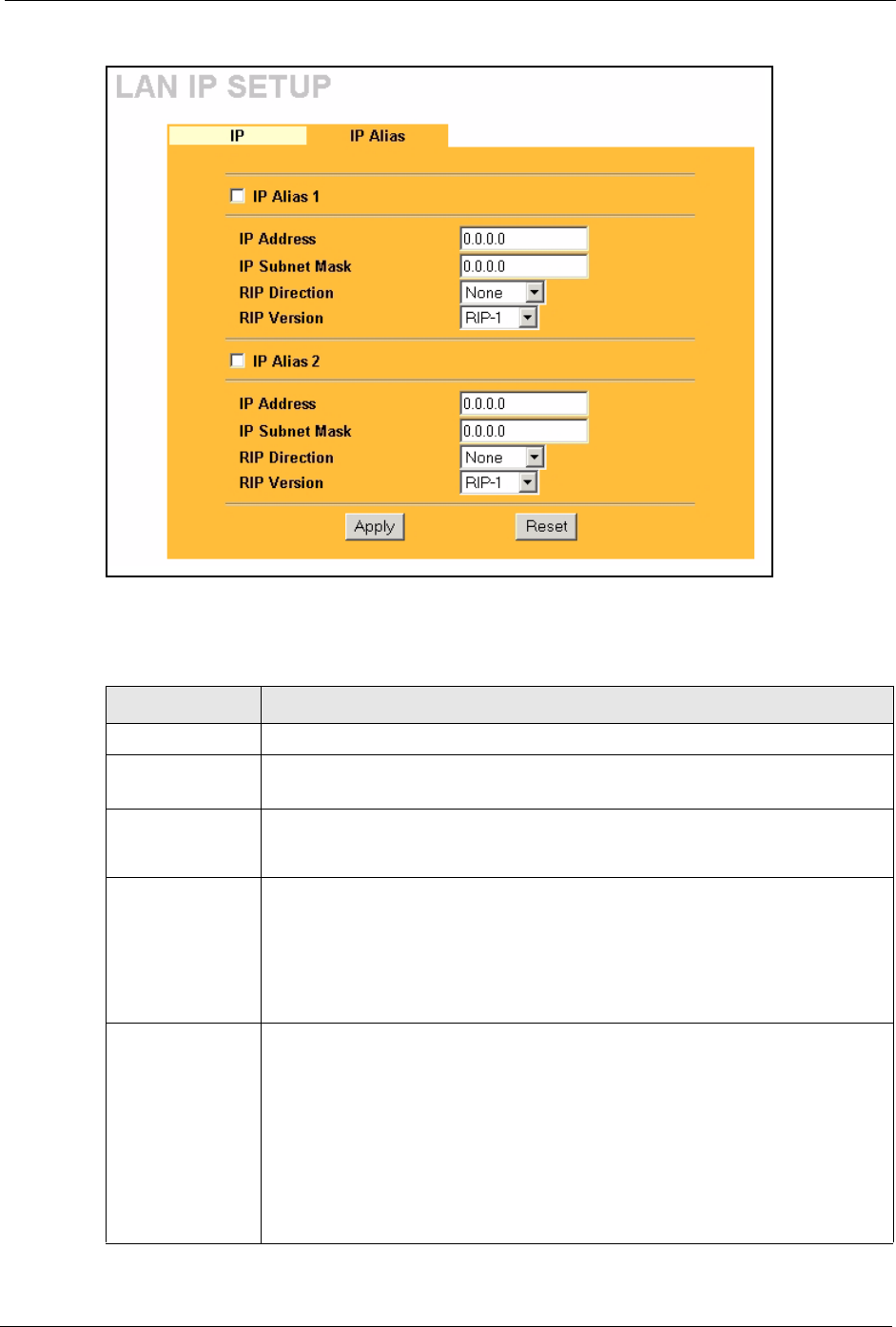 IP Alias 1, 2 Select the check box to configure another LAN network for the Prestige.