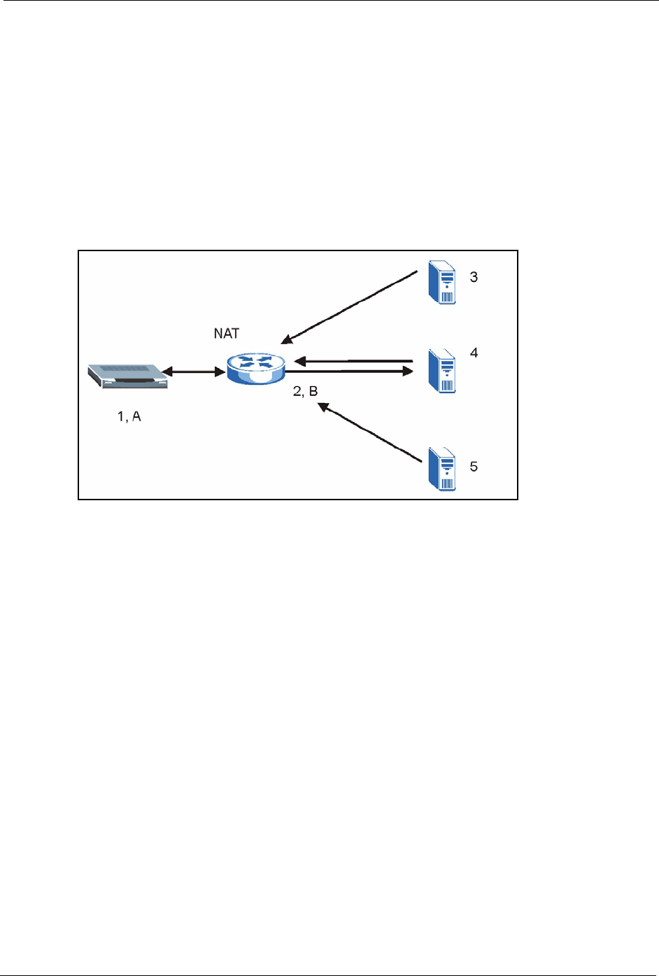 NAT router changes the Prestige’s IP address to 2 and port to B.