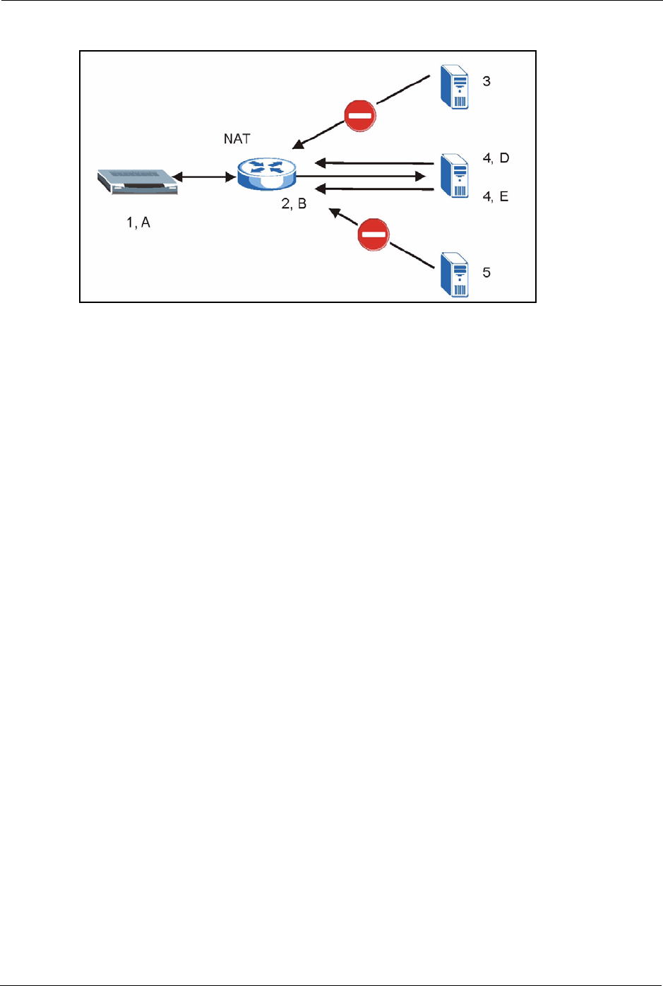 port D. The NAT router changes the Prestige’s IP address to 2 and port to B.
