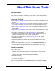 About This User's Guide About This User's Guide Intended Audience This manual is intended for people who want to want to configure the ZyWALL using the Web Configurator. How To Use This Guide • Read Chapter 1 on page 29 chapter for an overview of features available on the ZyWALL. • Read Chapter 3 on page 43 for web browser requirements and an introduction to the main components, icons and menus in the ZyWALL Web Configurator.